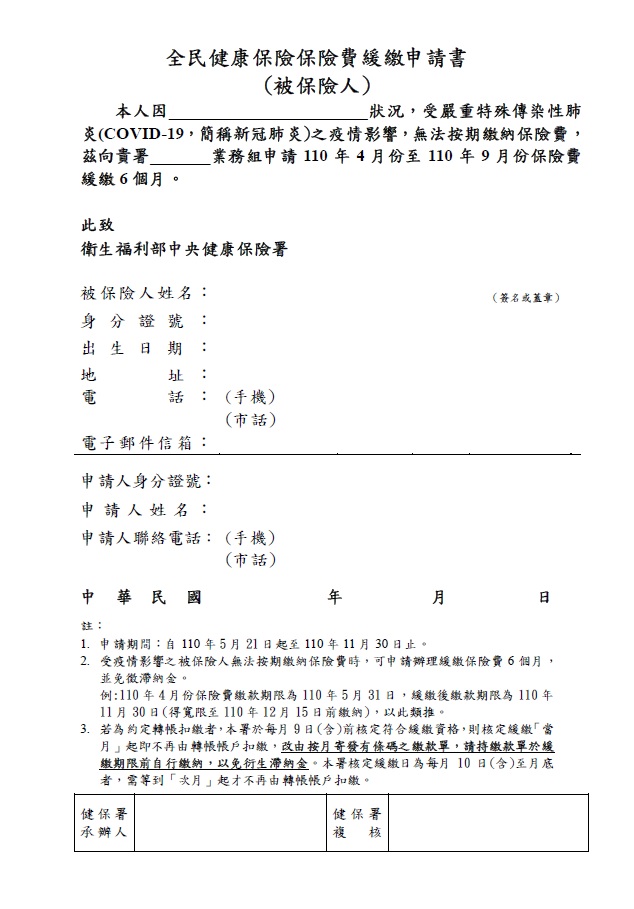110年受嚴重特殊傳染性肺炎(COVID-19)之疫情影響,檢附健保保費緩繳申請書一份,請自行列印使用,詳細說明請參閱申請書內容。