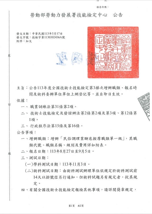 113年技術士技能檢定民俗調理業腳底按摩簡章將於8/20開賣囉!